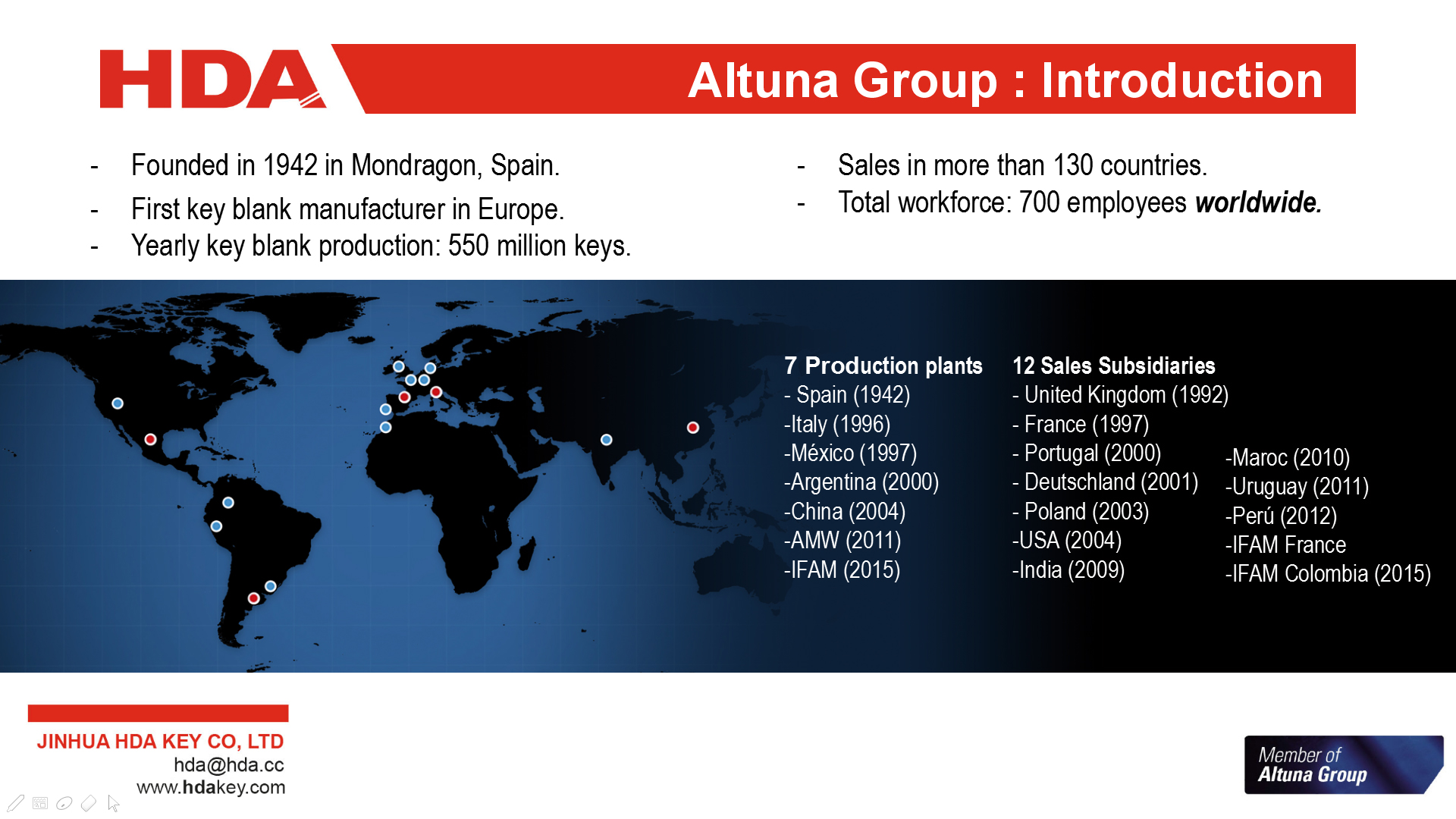 2005年,與歐洲三大鑰匙坯生產(chǎn)企業(yè)之一的西班牙JMA集團成立合資公司--金華HDA鑰匙有限公司。 2007年,轉(zhuǎn)為西班牙JMA集團獨資子公司。